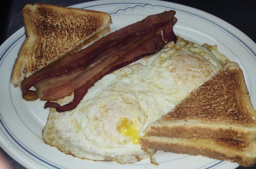 2 EGGS, SAUSAGE OR BACON, HASH BROWNS & TOAST